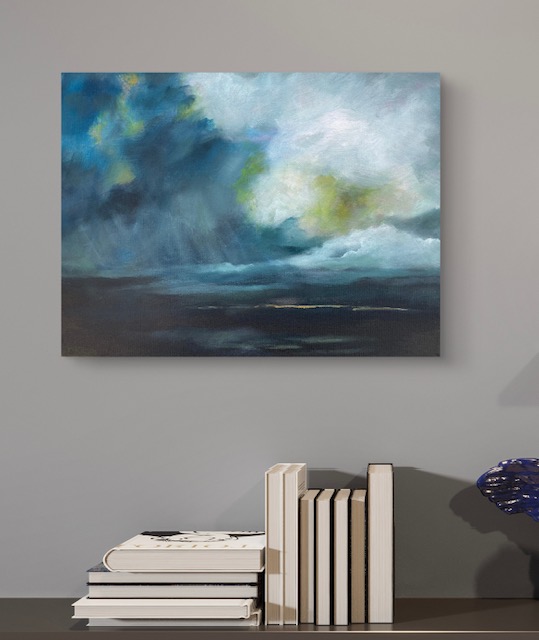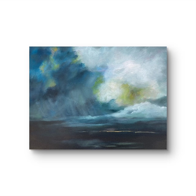 This atmospheric seascape captures the power and mystery of a storm unfolding over dark water. Deep blues and shifting clouds sweep across the sky, streaked with hints of light and color that suggest movement and change. Moody, dramatic, and quietly mesmerizing, the piece invites viewers into that fleeting moment when weather, sky, and sea become one.