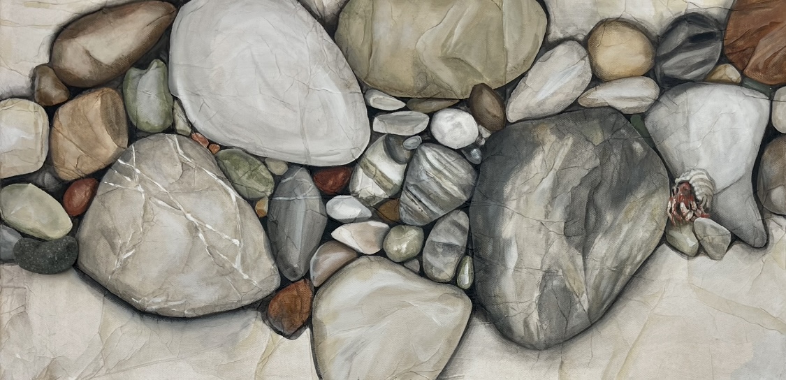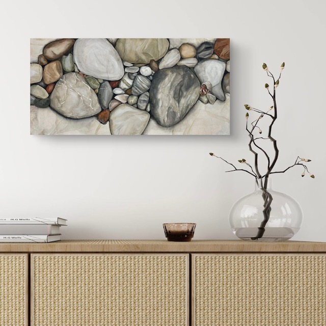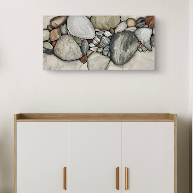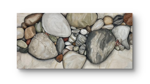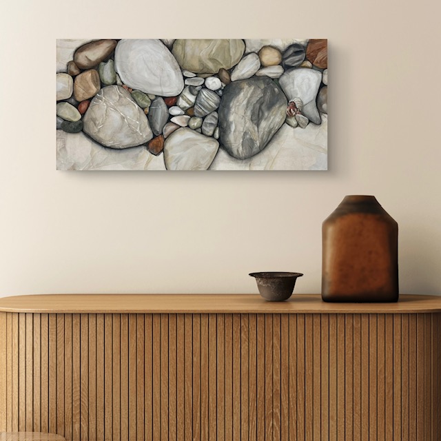 Collecting Memories is a quiet celebration of the small treasures we gather along life’s shoreline. A subtle heart rock is nestled within the composition—my signature reminder of love, connection, and the moments we choose to hold onto. And just like all of my rock paintings, a real heart rock is attached to the canvas itself. Can you find it?
