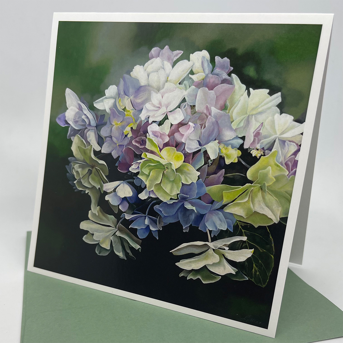 The soft, muted tones create a sense of tranquility, while the meticulous brushwork brings each petal to life, evoking the sensation of a gentle breeze. Set against a subtly blended background, the hydrangea appears to float, radiating grace and serenity.