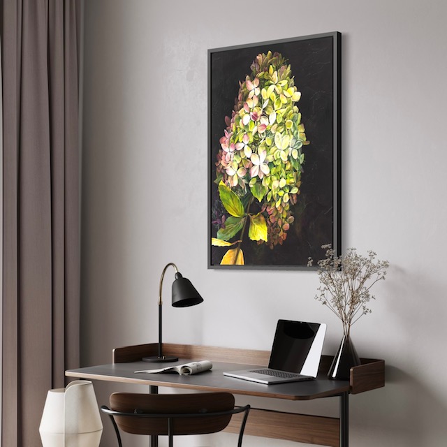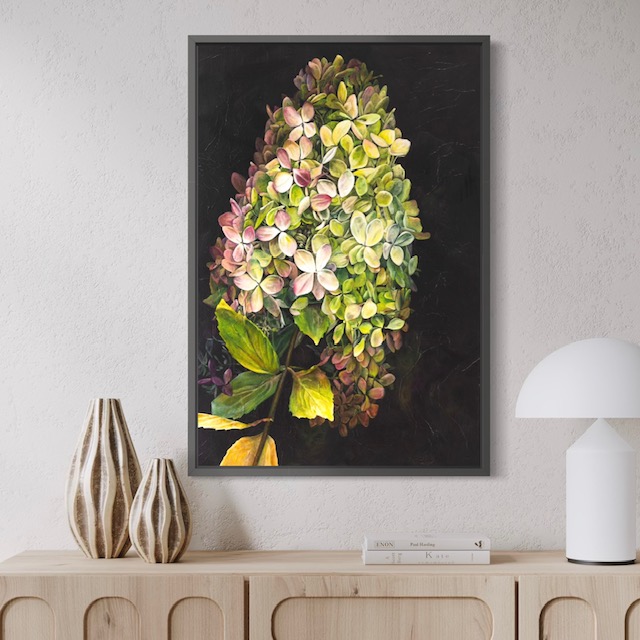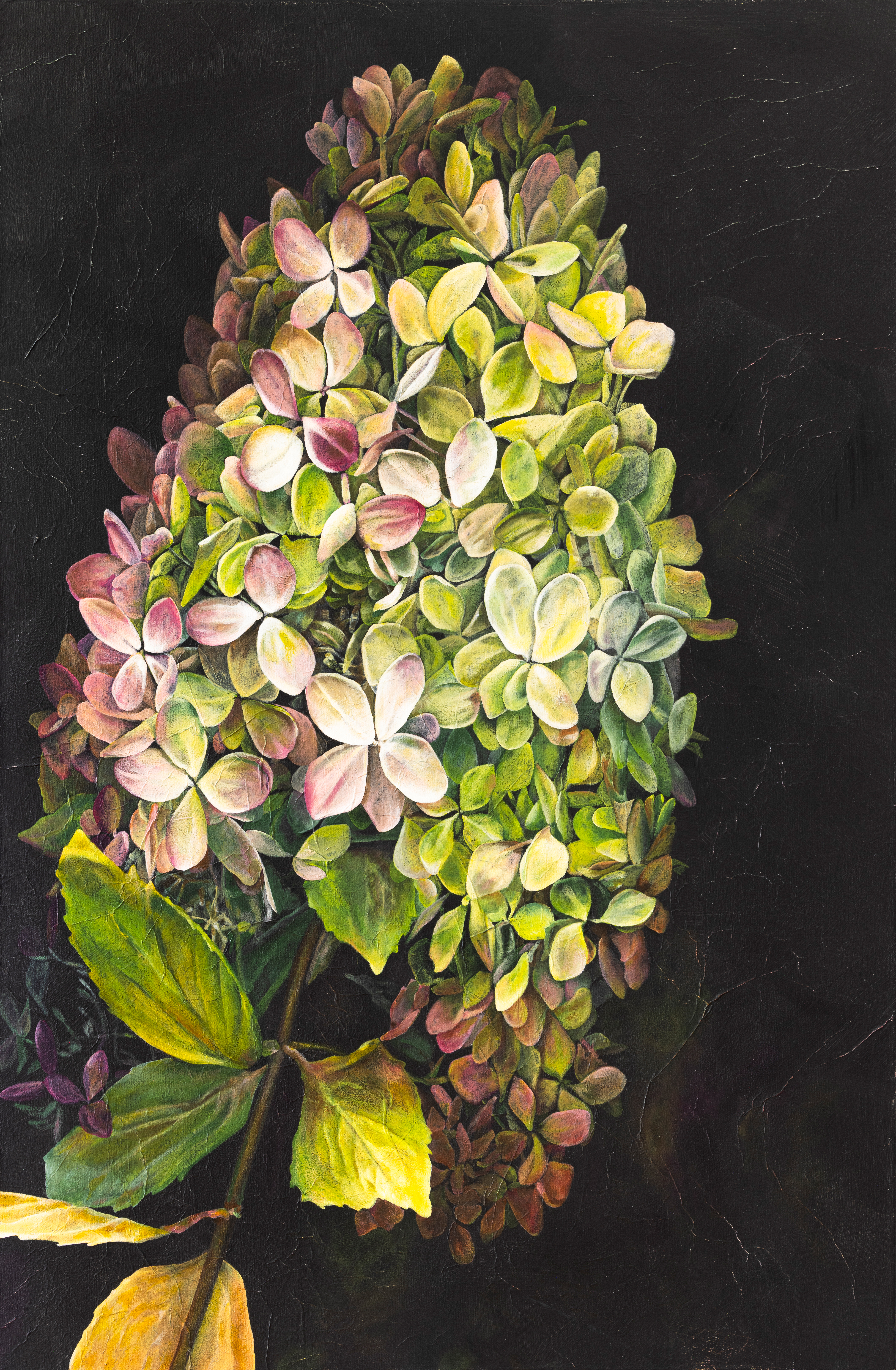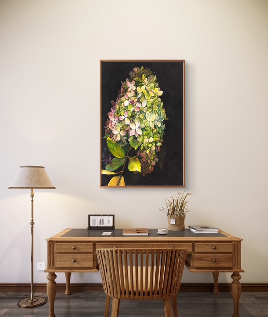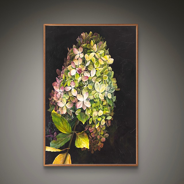 This richly detailed painting captures a hydrangea in its graceful transition of color, where soft pinks, gentle greens, and muted golds blend in a luminous cascade of petals. With its delicate realism and warm, meditative presence, this piece invites viewers to pause, reflect, and appreciate the beauty held in a single fleeting moment.