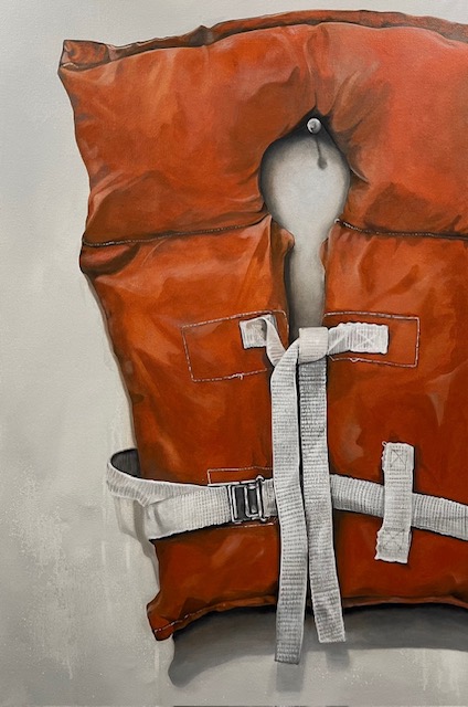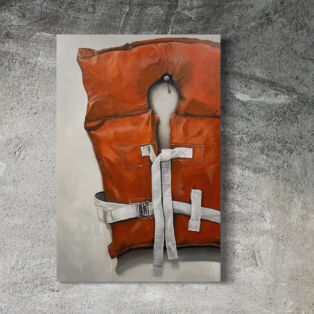 This vintage life preserver, with its faded orange fabric and sturdy straps, is rendered with careful detail. Both nostalgic and weather-worn, the painting reflects the enduring role of simple, reliable tools that have kept generations safe on the water.