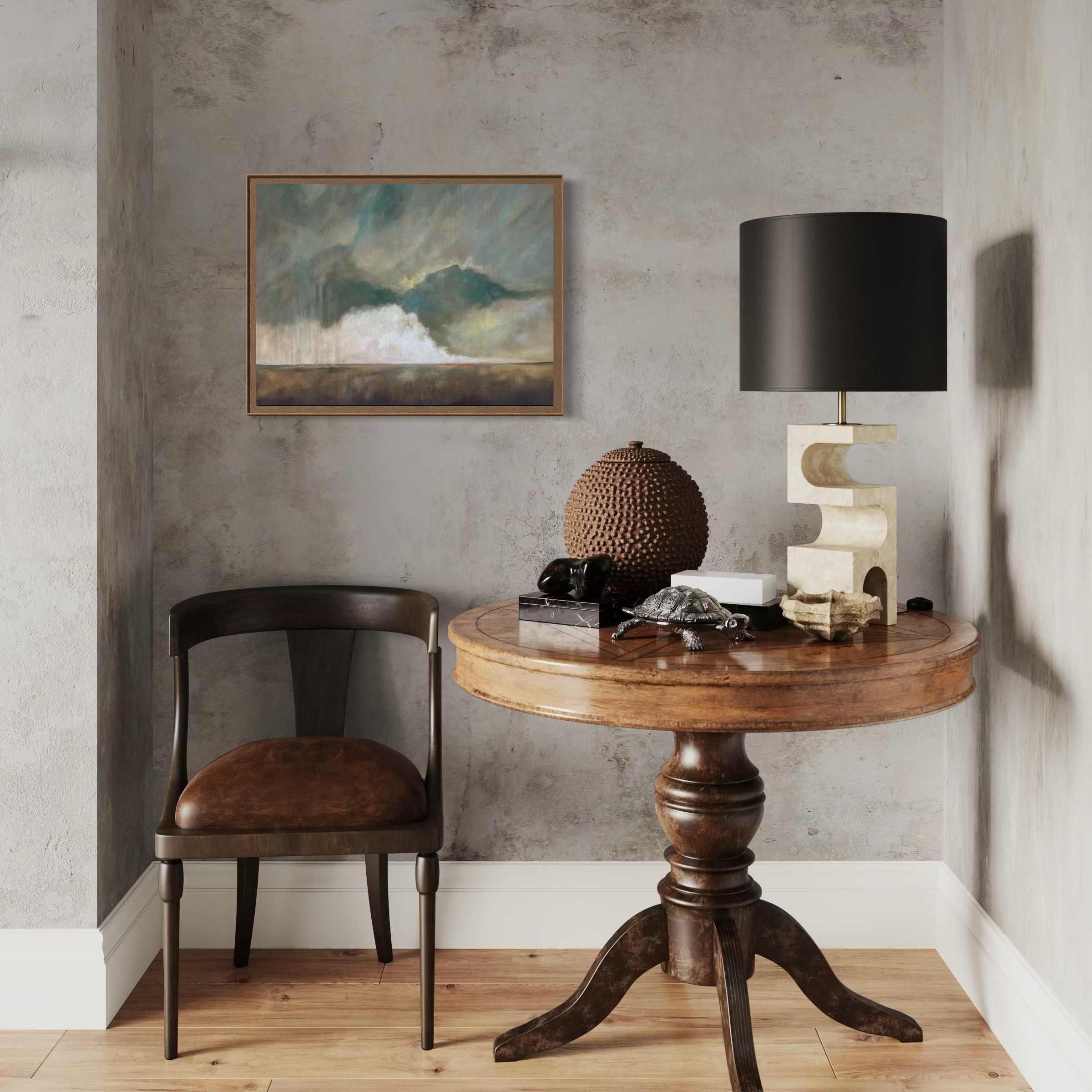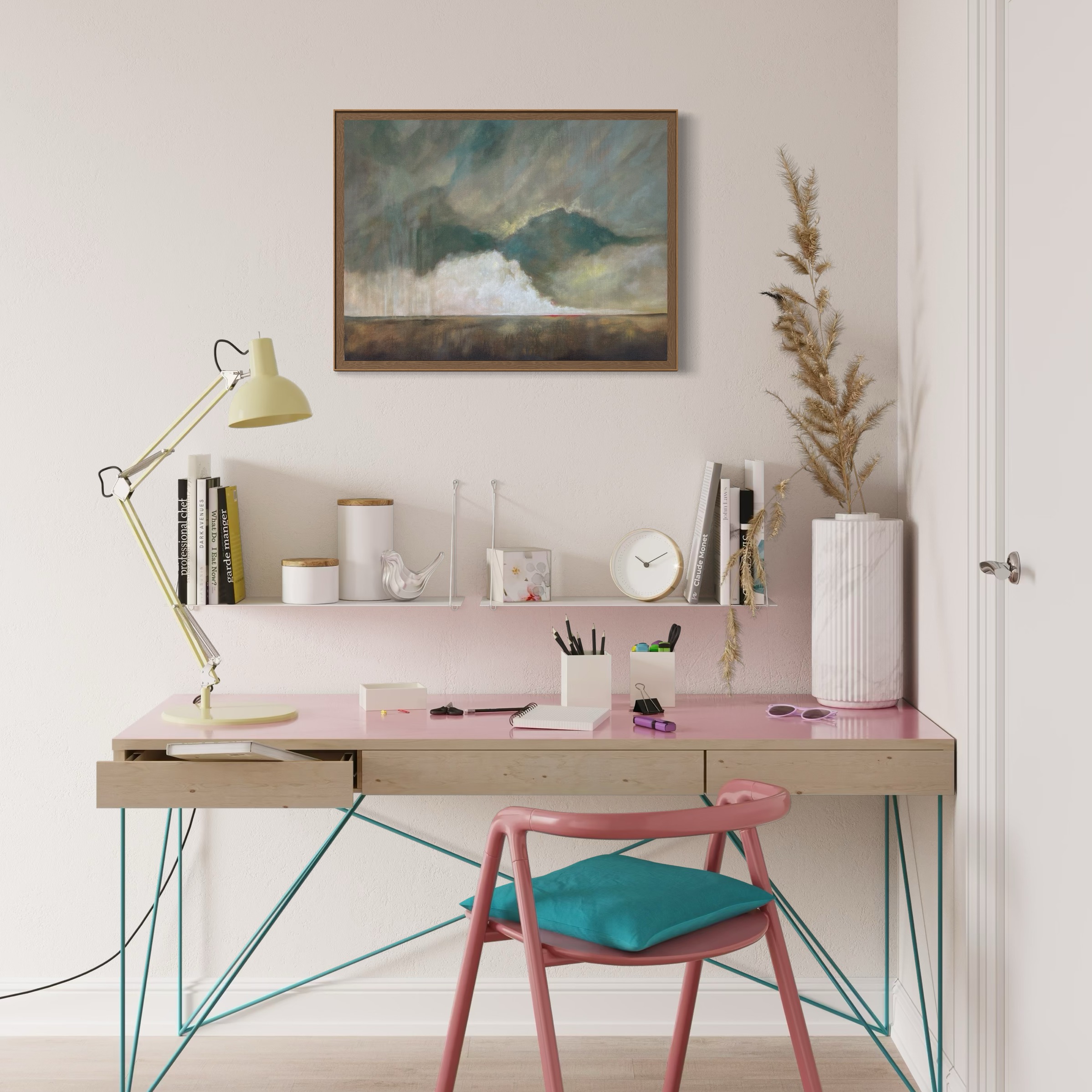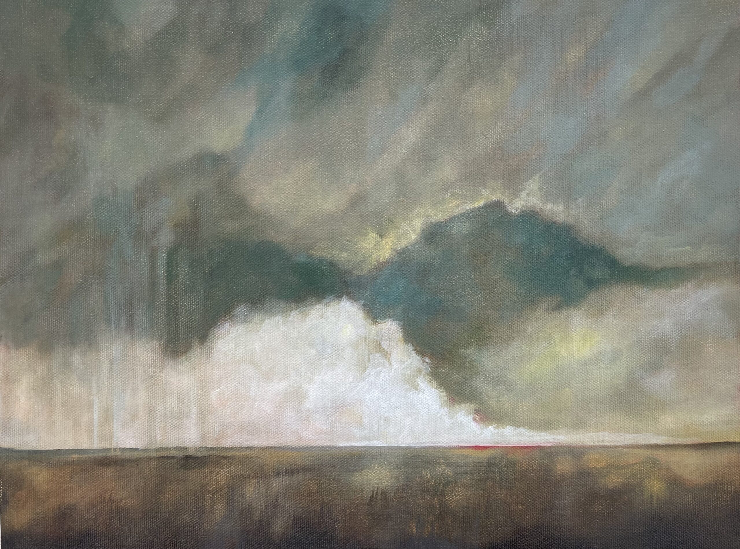 This landscape painting captures the quiet power of a rain-filled sky. Dark, layered clouds sweep across the horizon as streaks of rainfall descend, blurring the line between sky and earth. Subtle shifts of light hint at movement and change, evoking that still, reflective moment when the rain settles in and the world feels hushed and transformed.