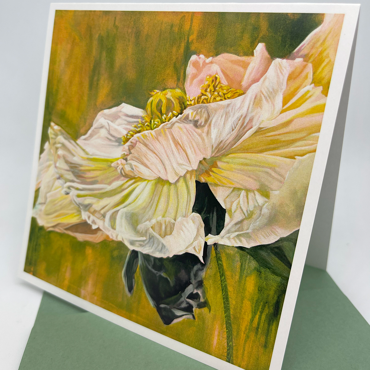 Experience a moment of vibrant beauty with “Whispers of Summer,” a stunning painting centered around a striking white poppy, its delicate petals unfurling in a vivid display. Gillian employs thoughtful, sweeping strokes to evoke a sense of movement and life within the flower, highlighting its ethereal charm.
