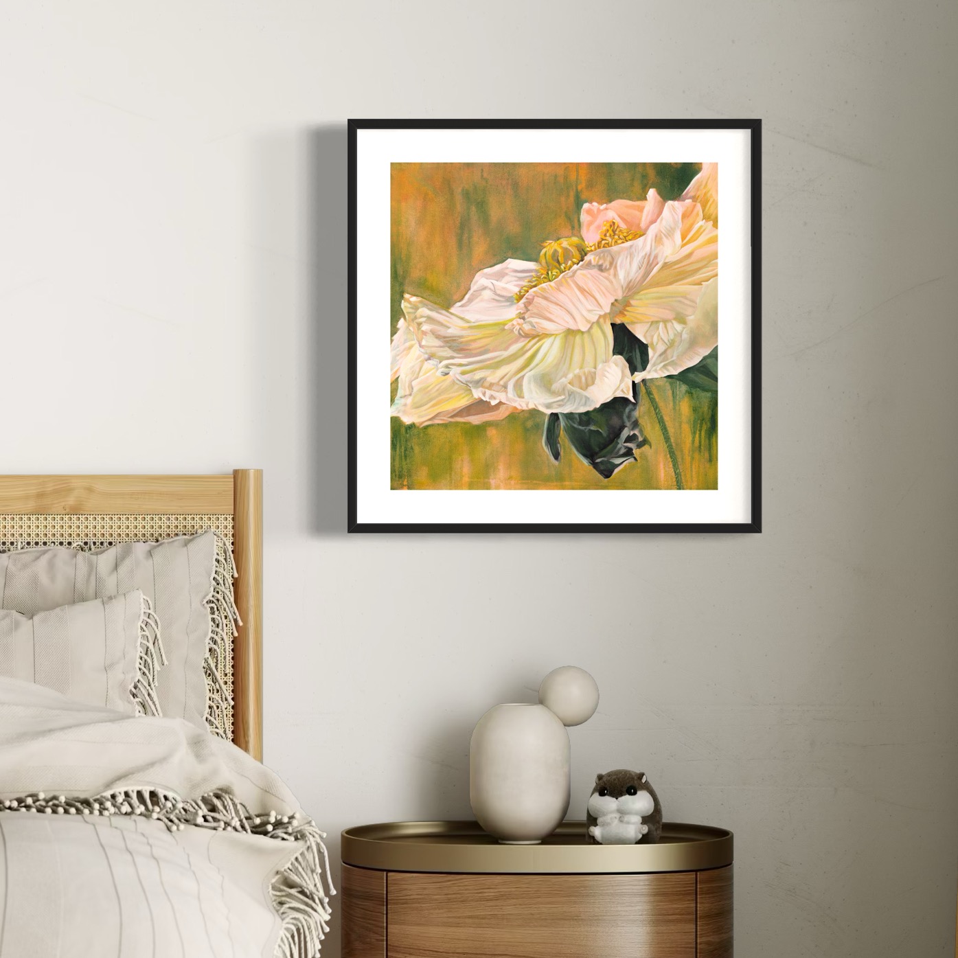 Each light brushstroke captures the fragility of the poppy while conveying the dynamic energy of its surroundings. The result is a captivating interplay of softness and strength, inviting viewers to immerse themselves in this blooming moment. Perfect for those who appreciate the beauty of nature, this artwork adds a touch of elegance and warmth to any space.